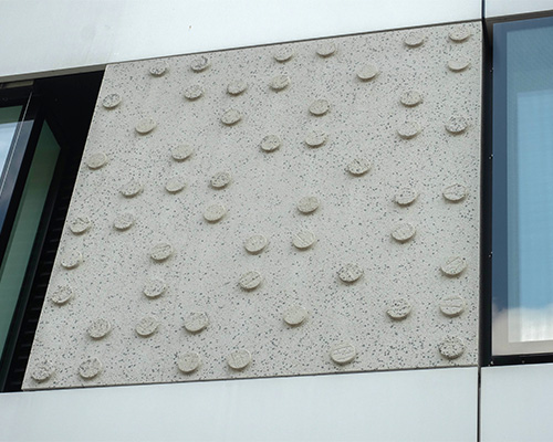 Dans ce cadre, Rebeton a conçu et fabriqué l’habillage des façades extérieures à l’aide de dalles minérales ACRYTHERM® réalisées sur-mesure. Les éléments ont été développés pour répondre précisément aux intentions architecturales, avec des pièces moulées intégrant des structures variées et des géométries spécifiques.